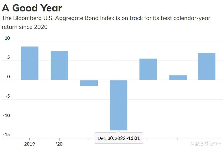 数据显示,截至周四,美国综合债券指数2025年累计回报已超过7%。该指数覆盖美国国债、政府相关债券、公司债以及抵押贷款支持证券和资产支持证券。相比之下,该指数在2024年的回报率仅为1.25%,2023年为5.5%。这一轮反弹发生在债券投资者仍努力走出历史性低谷之后,2022年,美联储为遏制通胀实施近40年来最快的加息周期,导致该指数当年下跌逾13%,创下有记录以来最差表现。